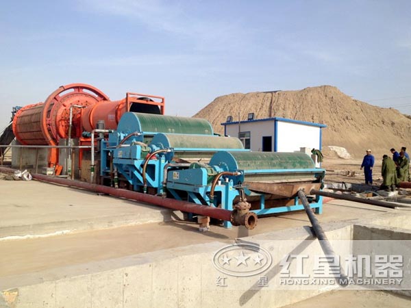 工藝配置:軸承傳動(dòng)節(jié)能型球磨機(jī)、螺旋分級(jí)機(jī)、磁選機(jī)(采用一次粗選,三次精選的磁選工藝流程)、永磁過濾機(jī)